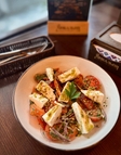 Легкий салат з м'яким сиром, болгарським перцем, чері, цибулі запревлений соусом з зеленні